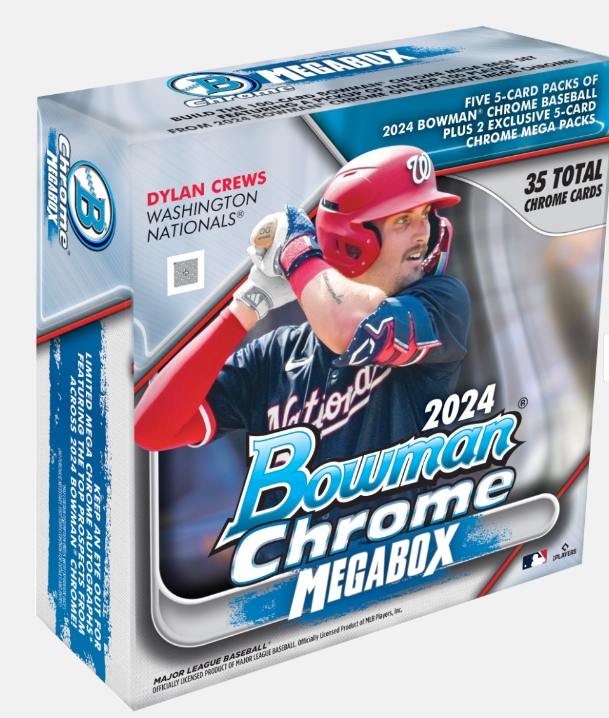 Look for five (5) 2024 Bowman Chrome packs and two (2) exclusive Mega Chrome packs per Mega Box!