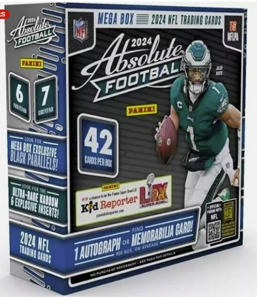 Get ready for the ultimate NFL trading card experience with this 2024 Panini Absolute Football Card MEGA BOX. Packed with 42 cards, this box includes everything you need to complete your collection. From rookie cards to parallel cards, this set has it all. With cards featuring players from the National Football League (NFL), this sports trading card set is a must-have for any football fan. Manufactured by Panini in the United States, this box is the perfect addition to your collection. Don't miss out on the chance to own this amazing set.