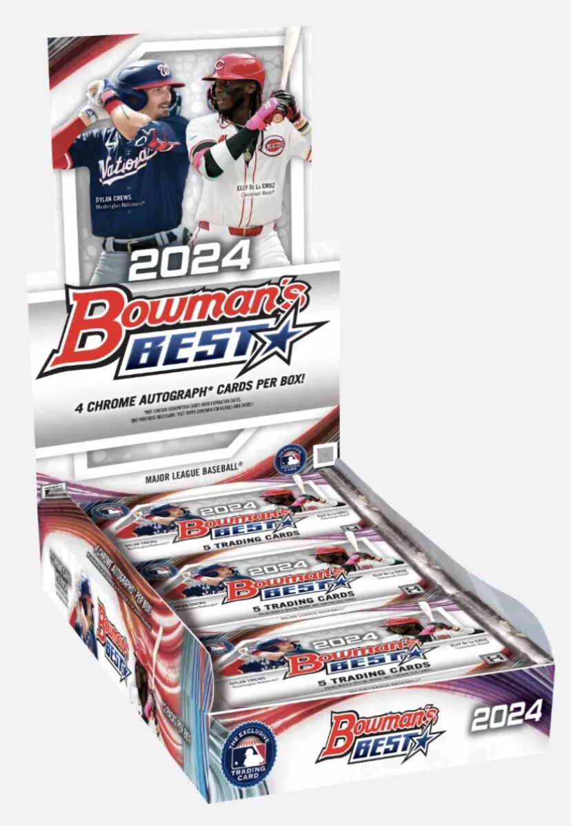 Each quantity purchased is for one (1) 2024 Bowman’s Best Hobby Box, factory sealed. Includes 12 packs per box, 5 cards per pack. Four (4) Chrome Autograph cards included in each box!