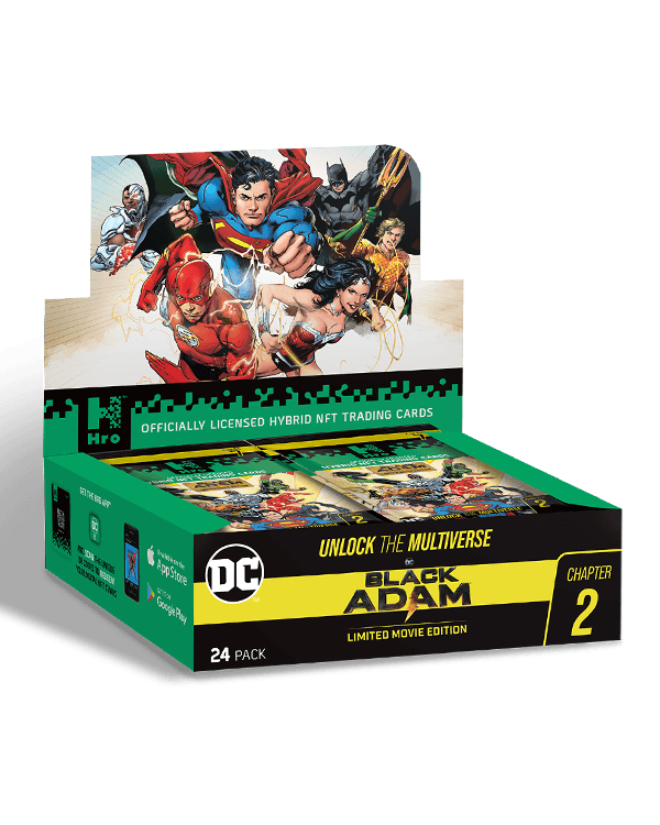 DC UNLOCK THE MULTIVERSE: Our hybrid collection of action-packed physical trading cards (complete with digital NFT twins) has returned! Now, you can collect an all-new set of iconic art from DC's comic book history featuring fan favorites like Batman, Superman, Wonder Woman, and so many more. In addition to journeying across multiple eras that span the past and present, we'll also celebrate how the hierarchy of power is changing in the DC Multiverse thanks to the release of "Black Adam" in cinemas around the world on October 21, 2022. Don't miss out on this thrilling expansion of our one-of-a-kind hybrid lineup (if you do, it just might be your villain origin story). HYBRID NFT TRADING CARDS: Each physical trading card is uniquely minted and connected to a 1:1 digital NFT. Simply open up the Hro mobile app and scan the QR code on the back of the physical card to unlock this feature, resulting in a digital NFT twin complete with Proof of Authenticity and Ownership validated by the trust/security of the Ethereum blockchain. GUARANTEED HOLOGRAPHIC TRADING CARDS: Holographic cards are guaranteed in every flowpack you buy! Each individual flowpack contains seven or eight cards with at least one holo per set. LIMITED-EDITION "BLACK ADAM" MOVIE CARDS: Commemorate the release of Warner Bros. and DC's "Black Adam," in cinemas now, with special cards that take you deeper into the conflict of the film. Whether it's hi-res poster designs, special graphics, or stylized character art...you'll get a glimpse of how the epic faceoff between Black Adam and the Justice Society is going to unfold. COLLECT: Forge your legacy as additional card drops are released throughout the year, bringing you closer to your favorite DC Super Heroes and Super-Villains as well as the places they call home. Engage with fans from around the world while you venture into the vast depths of the DC Multiverse. BUY / SELL / TRADE: To rise to the top of the leaderboards, you'll need to power up your trading skills, either directly in the Hro marketplace or outside of it if preferred. Negotiate with buyers, sellers, and other traders to curate your dream lineup of cards. All activity in the Hro platform is heroically backed by Blockchain technology that offers Proof of Authenticity and Ownership over each asset so you can trade with confidence no matter how much experience you have. COMPETE: Seek out the rarest cards, rise to the top of the global leaderboards, and unlock the chance to win special rewards that'll bring the Multiverse to life. EXPERIENCE: Celebrating your fandom has never looked quite like this! Our dynamic global community is taking collecting to the next level...join us as this new era unfolds by visiting the Hro platform daily to see how the DC Multiverse continues to expand all year long. JOIN THE COMMUNITY: Your voice, interests, knowledge, and passion always come first in the Hro universe. Each member powers up the platform to span borders and timezones, illustrating the timeless connection fostered by DC's unforgettable storytelling. A pack may contain any trading cards from the collection tiers below with the following odds in each pack. Click Here to see the full collection details.