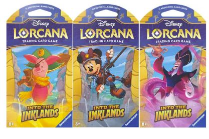 Unlike starter decks, booster packs contain 12 random cards from the Disney Lorcana TCG set Into the Inklands.