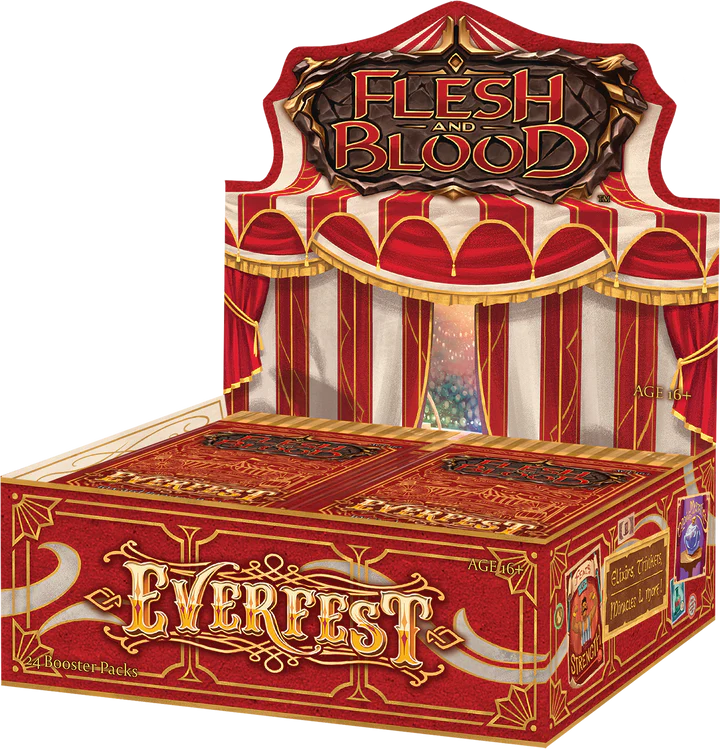 Step right up, step right up! The greatest show in Rathe is coming to a town near you! Everfest is a supplementary booster set, designed to expand constructed play with new cards for every hero in the game. Within the bustling grounds of the Everfest carnival, all fashion of performers, peddlers, and frolicking fun is to be found. Will you find fun, fame, or good fortune in the carnival slot of your Everfest booster pack, or perhaps take center stage and become the star of the show? ! A world first! Everfest is the world's first full production TCG product featuring fully recyclable paper booster wrappers! Production scale paper flowwraps have been years in the making. In partnership with Cartamundi, we are proud to not only be the industry leader in material sustainability, but for setting a new standard in consumer product experience. Everfest boosters look and feel incredible! 198 card set (1 Fabled, 3 Legendary, 45 Majestic, 61 Rares, 88 Commons)