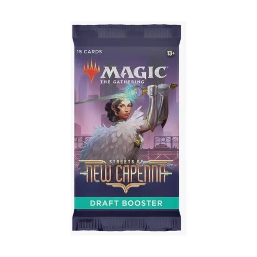 DESCRIPTION Draft Boosters are specifically designed for the best Magic: The Gathering booster draft play experience. Each Streets of New Capenna Draft Booster contains 15 Magic cards and 1 token, ad card, or counter punchout card, with a combination of 1 card of rarity Rare or higher and 3 Uncommon, 10 Common, and 1 Land cards. A traditional foil card of any rarity replaces a Common in 33% of Streets of New Capenna Draft Boosters. Traditional foil Borderless Mythic Planeswalker in <1% of boosters.