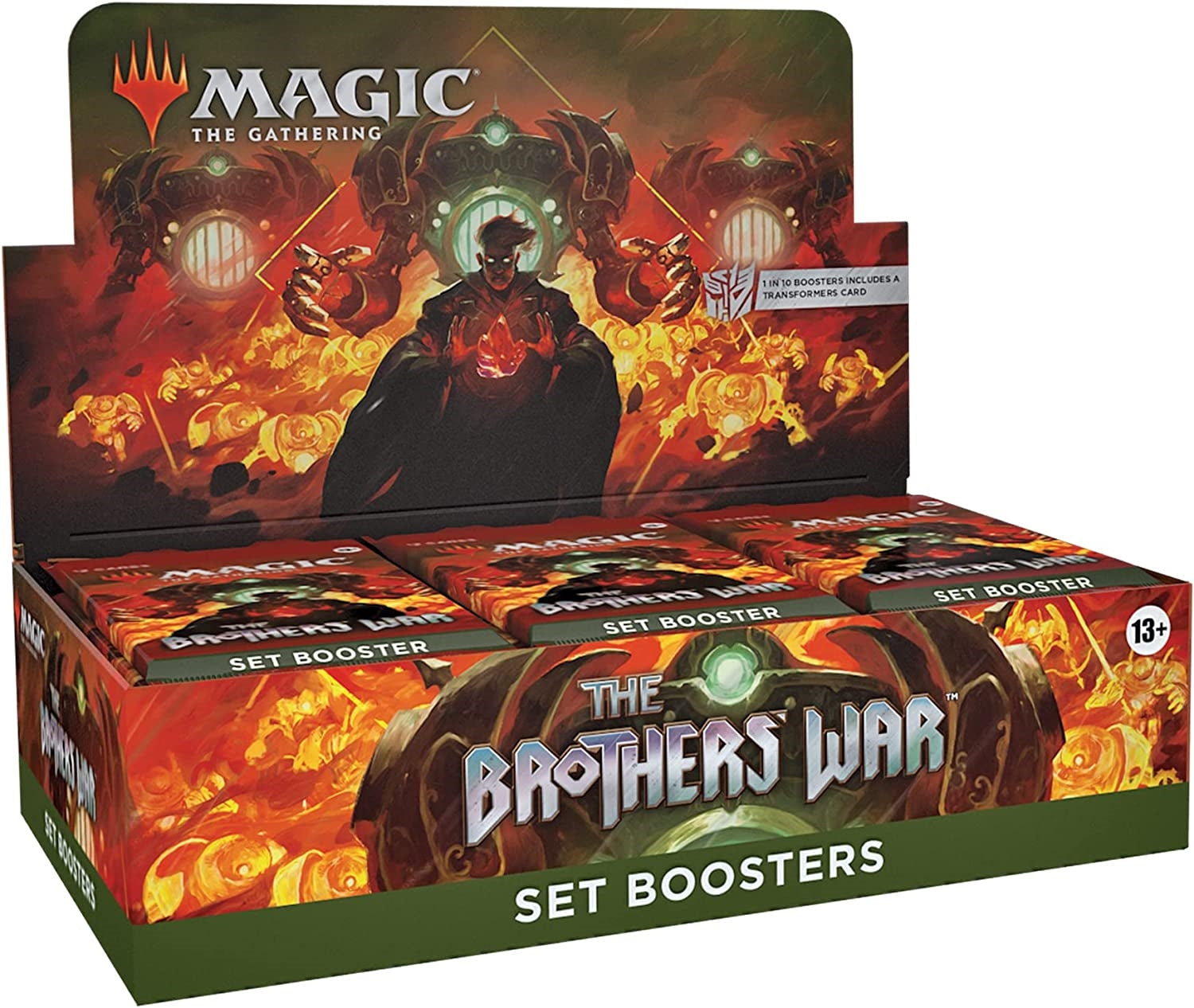 The Brothers’ War Set Booster Box contains 30 The Brothers’ War Set Boosters. Each Set Booster contains 12 Magic cards, 1 Art Card, and 1 token/ad card or card from “The List” (a special card from Magic's history—found in 25% of packs).